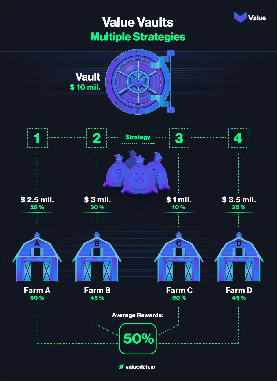 Value Vaults are yield aggregators that put your assets to work, we search for the highest returns and use multiple strategies to keep the returns as high as possible.